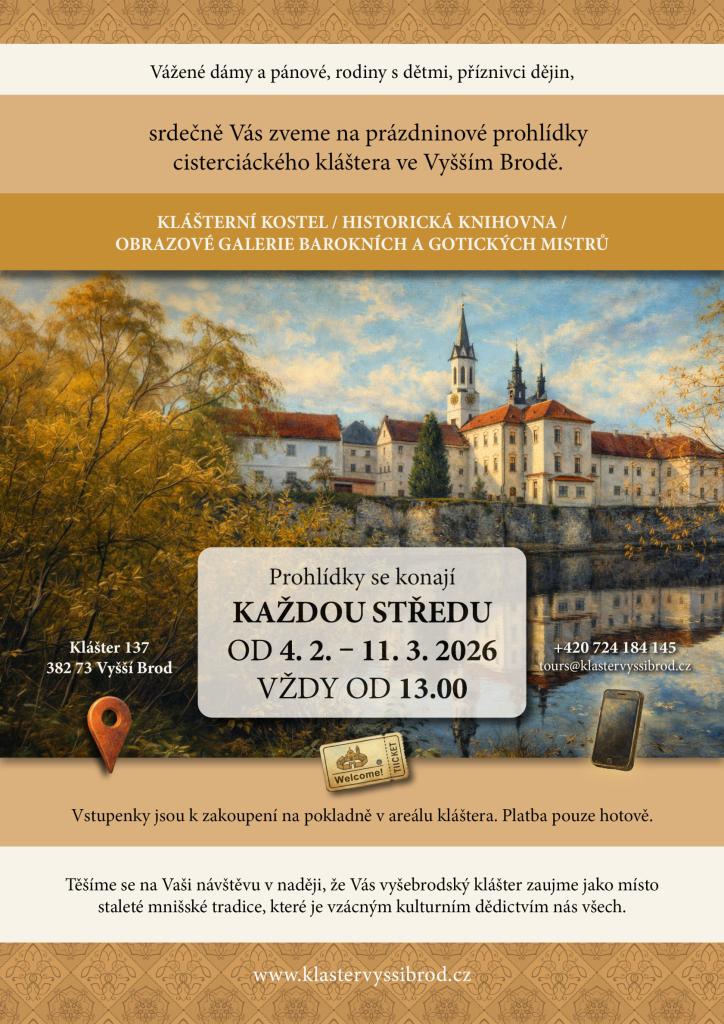 V rámci komentované prohlídky navštívíte klášterní kostel, historickou knihovnu a obrazové galerie barokních a gotických mistrů. Seznámíte se s historií kláštera, životem cisterciáckých mnichů i významem Vyššího Brodu v kontextu českých dějin.